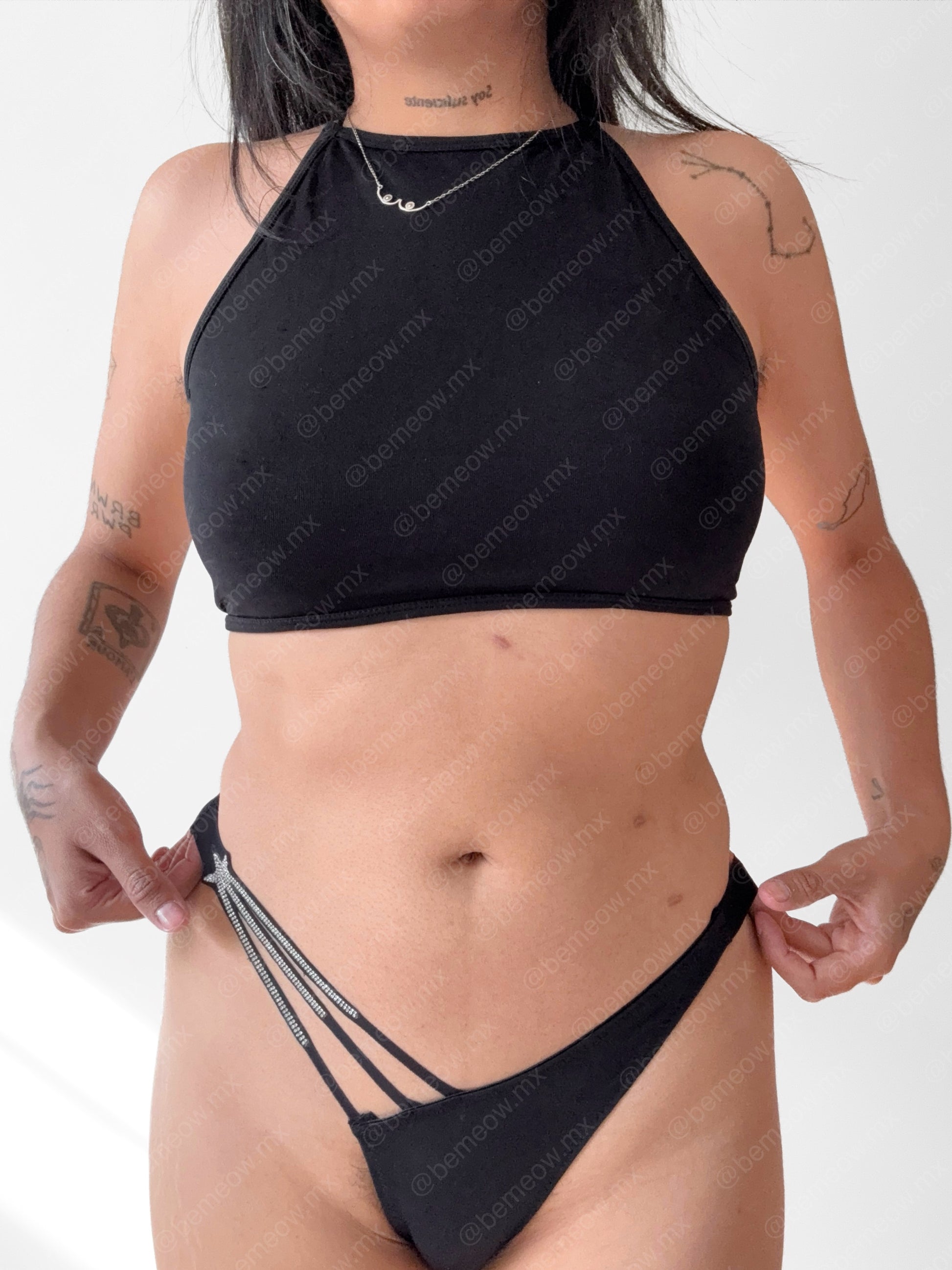 Esta prenda en particular está hecha de lycra y elástico con detalle de tiras en la parte lateral, corte tipo tanga. Habilitaciones de metal.