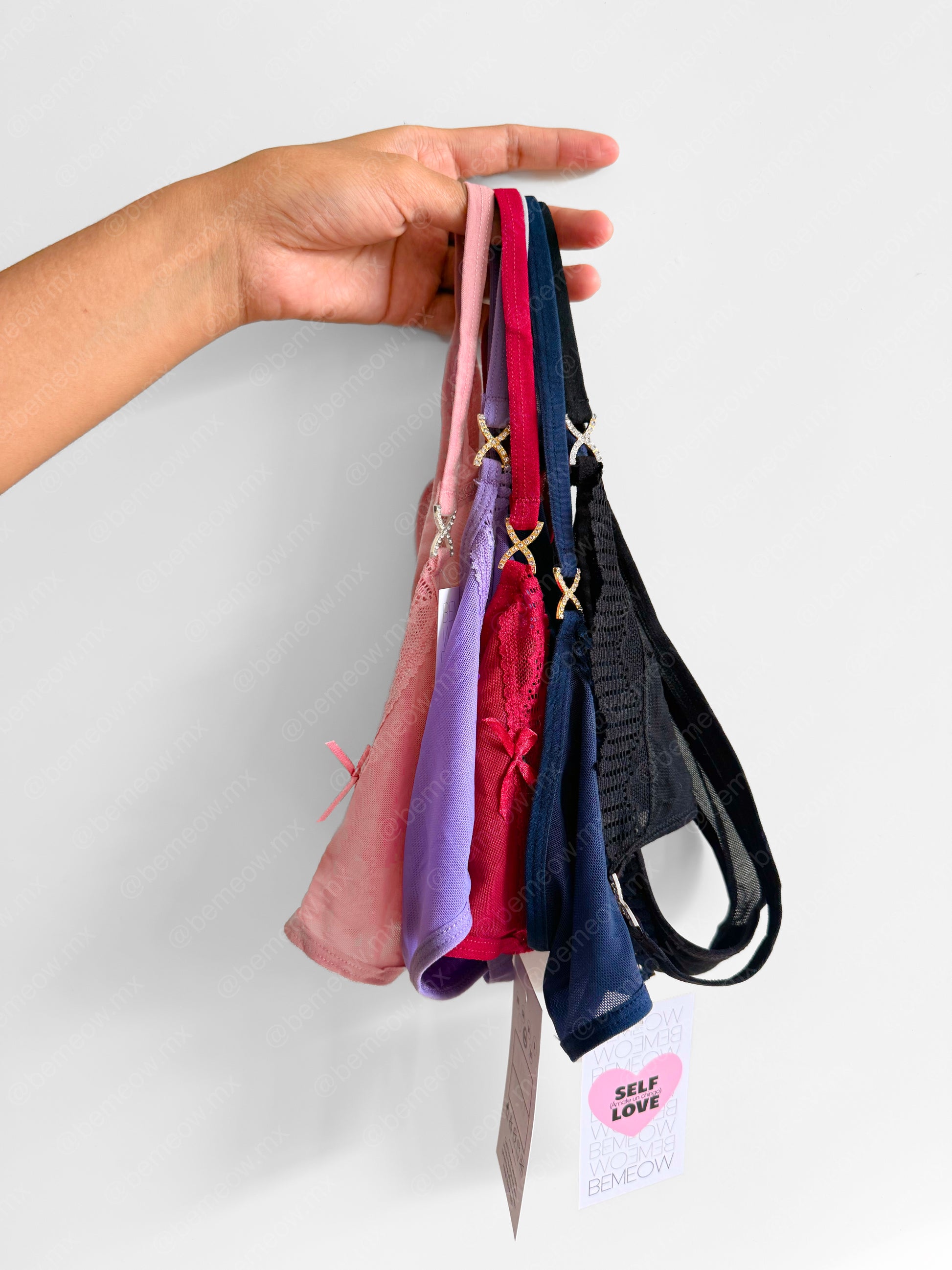 Esta prenda en particular está hecha de lycra y elástico con detalle de tiras en la parte lateral, corte tipo tanga. Habilitaciones de metal.