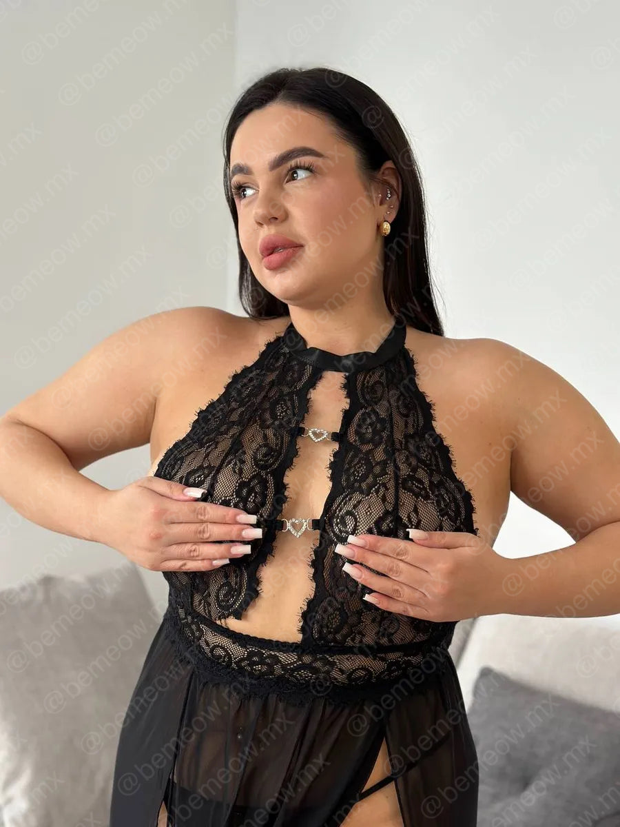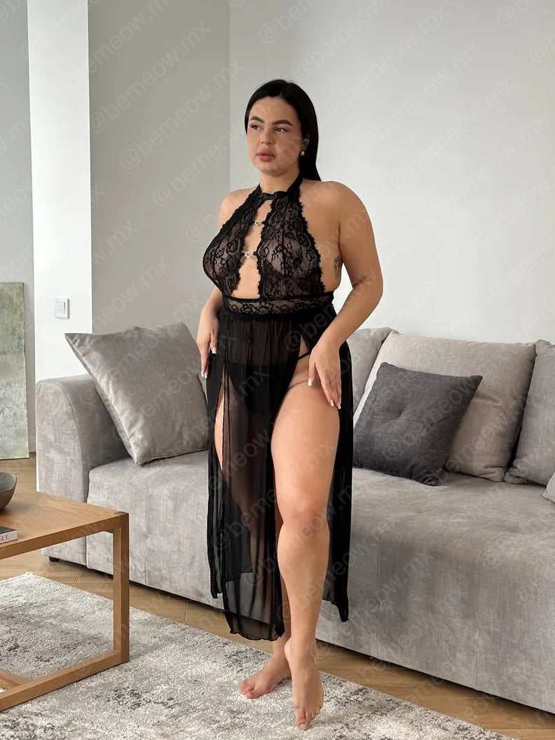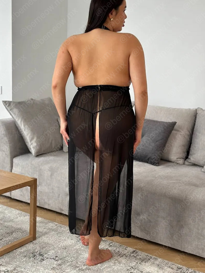 Vestido BABYDOLL largo de tela mesh, escote halter, se compone de 2 piezas: vestido y tanga a juego.